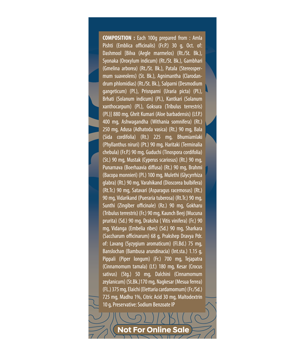Each 100g prepared from : Amla Pishti (Emblica officinalis) (Fr.P.) 30 g, Oct. of: Dashmool [Bilva (Aegle marmelos) (Rt./St. Bk.), Syonaka (Oroxylum indicum) (Rt./St. Bk.), Gambhari (Gmelina arborea) (Rt./St. Bk.), Patala (Stereospermum suaveolens) (St. Bk.), Agnimantha (Clarodandrum phlomidias) (Rt./St. Bk.), Salparni (Desmodium gangeticum) (PI.), Prisnparni (Uraria picta) (PI.), Brhati (Solanum indicum) (PL), Kantkari (Solanum xanthocarpum) (PI.), Goksura (Tribulus terrestris) (PI.)] 880 mg, Ghrit Kumari (Aloe barbadensis) (Lf.P.) 400 mg, Ashwagandha (Withania somnifera) (Rt.) 250 mg, Adusa (Adhatoda vasica) (Rt.) 90 mg, Bala (Sida cordifolia) (Rt.) 225 mg, Bhumiamlaki (Phyllanthus niruri) (Pt.) 90 mg, Haritaki (Terminalia chebula) (Fr.P.) 90 mg, Guduchi (Tinospora cordifolia) (St.) 90 mg, Mustak (Cyperus scariosus) (Rt.) 90 mg, Punanava (Boerhaavia diffusa) (Rt.) 90 mg, Brahmi (Bacopa monnieri) (PI.) 100 mg, Mulethi (Glycyrrhiza glabra) (Rt.) 90 mg, Varahikand (Dioscorea bulbifera) (Rt.Tr.) 90 mg, Satavari (Asparagus racemosus) (Rt.) 90 mg, Vidarikand (Pueraria tuberosa) (Rt.Tr.) 90 mg, Sunthi (Zingiber officinale) (Rz.) 90 mg, Gokharu (Tribulus terrestris) (Fr.) 90 mg, Kaunch Beej (Mucuna prurita) (Sd.) 90 mg, Draksha ( Vitis vinifera) (Fr.) 90 mg, Vidanga (Embelia ribes) (Sd.) 90 mg, Sharkara (Saccharum officinarum) 68 g, Prakshep Dravya Pdr. of: Lavang (Syzygium aromaticum) (FI.Bd.) 75 mg, Banslochan (Bambusa arundinacia) (Int.sta.) 1.15 g, Pippali (Piper longum) (Fr.) 700 mg, Tejapatra (Cinnamomum tamala) (Lf) 180 mg, Kesar (Crocus sativus) (Stg.) 50 mg, Dalchini (Cinnamomum zeylanicum) (St.Bk.) 170 mg, Nagkesar (Mesua ferrea) (FL.) 375 mg, Elaichi (Elettaria cardamomum) (Fr./Sd.) 725 mg, Madhu 1%, Citric Acid 30 mg.